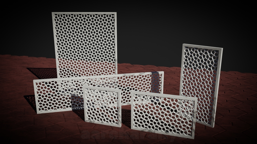 This blend file contains 5 Jali Screens mesh models based on Cairo Tiling pattern. The 5 screens are in sizes 1m x 1m, 1m x 1.5m, 1m x 2m, 2m x 3m & 1m x 4m (Sizes are nearly approx.)