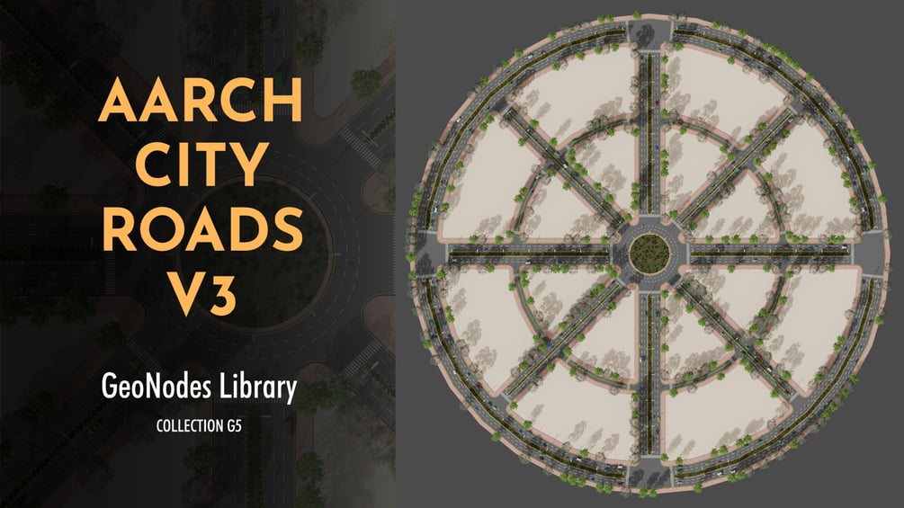 AarchCityRoads ver 3 (ACRv3) is a fully procedural, non-destructive & parametric City Roads Layout Generator, built entirely with Geometry Nodes, Blender 4.5.