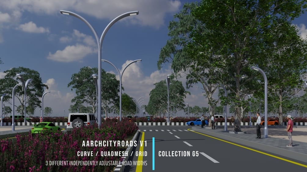 ACRv3 generates a featured road layout from a 2D mesh, positioned at ground plane, treating mesh edges as center-lines for the roads. It adds essential design features like lane markings, central kerb/lines, pedestrian crossing & sidewalks alongwith light & traffic signal poles. It has option to add roundabouts. It also adds vehicles, trees, shrubs & peoples to aid design visualisation. Plots generated from the roads layout can be extracted for further design development. The 2D mesh can be generated directly in the viewport or via Geometry Nodes itself.
