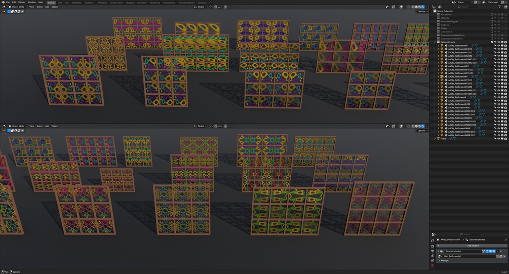 xiii) Pattern Screens/Jaali - a collection of 9 unique Nodegroups (alongwith 3 presets for each Nodegroup) to generate colorful freeform Glass panel Screens/Jaalis
